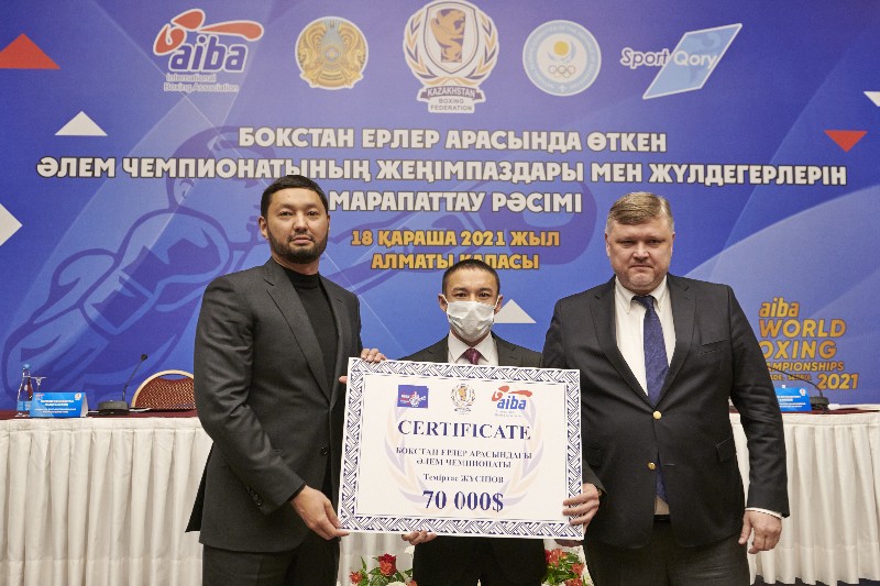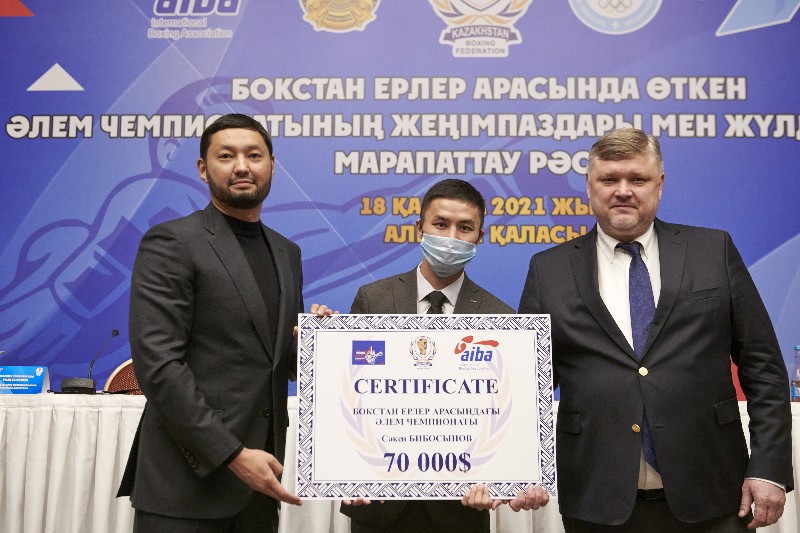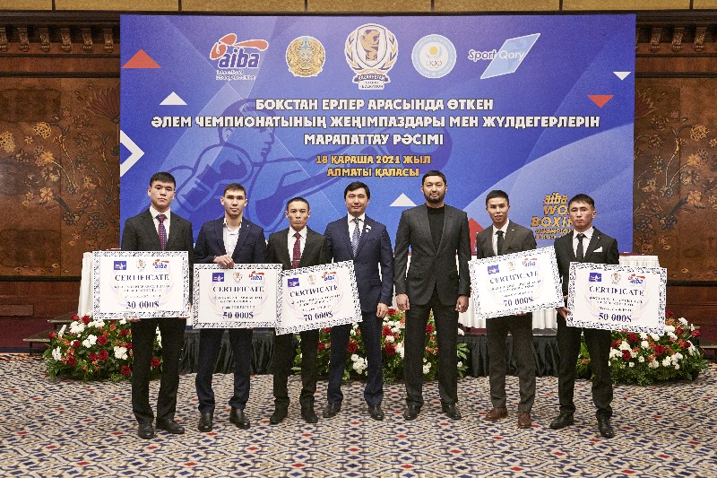 Денежные премии от своего имени боксёрам вручил глава КФБ Кенес Ракишев. Чемпионы мира получили по 70 тысяч долларов США, серебряные призёры – по 50 тысяч долларов, обладатель бронзы – 25 тысяч долларов США. Главный тренер мужской команды боксеров Кайрат Сатжанов, личные тренеры чемпионов мира Куанышбай Кокушев и Мырзагали Айтжанов получили по 10 тысяч долларов США. Личные тренеры серебряных призёров Ильяс Оралбеков и Азамат Макажанов – по 8,5 тысяч долларов, личный тренер бронзового призера Бауыржан Аманбаев – 5 тысяч долларов.