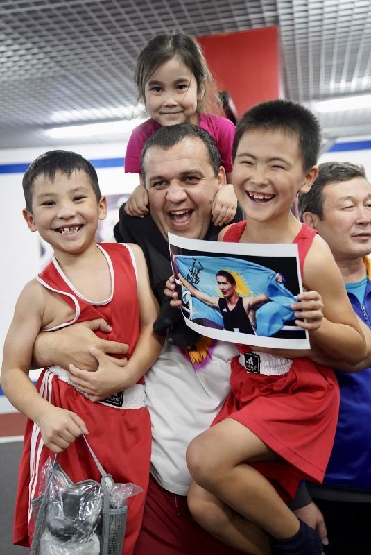 Умар Кремлёв қазақстандық былғары қолғап шеберлерімен жаттығ...